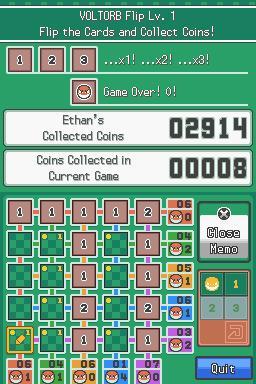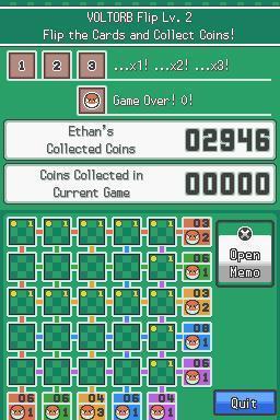 游戏进行过程中如果选择下屏右下角的“Quit”,该局游戏就会退出,当前硬币数就会存到硬币盒中。所以说当游戏进行过程中感到困难时,可以选择退出见好就收,以免不小心翻到雷电球导致白忙一场。