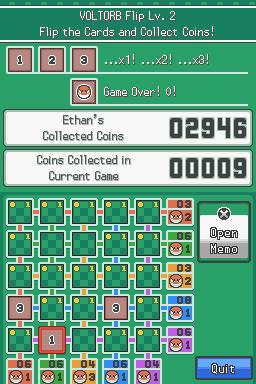 选择下屏右上角的“Open Memo”或者按DS上的“X”键就打开了标记牌功能,使用该功能可以将未翻开的牌标记为“1”、“2”、“3”或“雷电球”。需要注意的是标记的时候一定要打开标记牌功能(下屏右边会出现标记菜单),否则就是翻牌的操作。