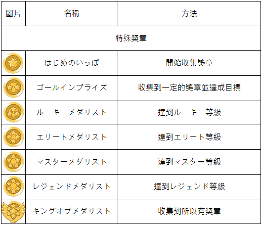 獎章有特殊獎章、冒險獎章、對戰獎章、娛樂獎章、挑戰獎章那麼現在獻上255枚獎章的入手方式(歡迎挑刺):> 特殊獎章: