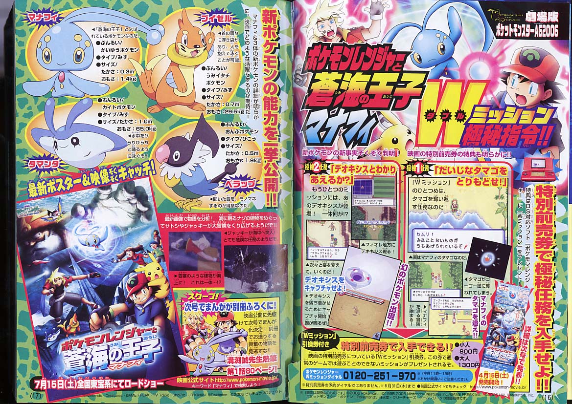 新PM的属性和新图片终于公布了^^~另外,今年预定新剧场版的电影票可以在Ranger游戏中开启迪奥西斯及玛纳霏的隐藏事件哦~ 下面来看看苍海的王子&Pokemon Ranger的最新资料吧~