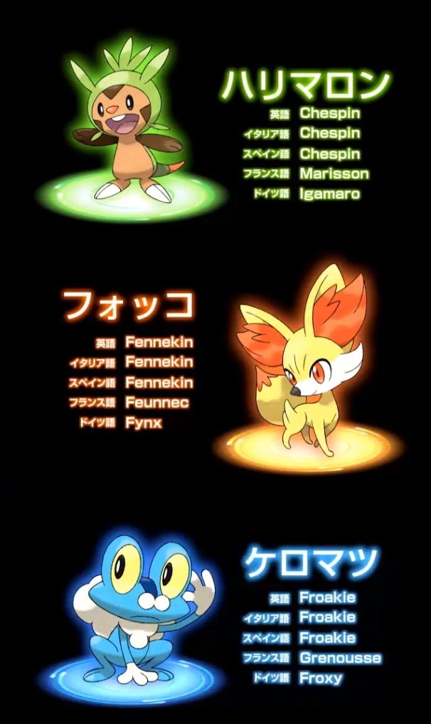 此次发布会上,我们见到了即将登陆的新作会有新的3主角精灵登场,它们分别是火系的「フォッコ」、草系的「ハリマロン」以及水系的「ケロマツ」。