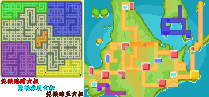 另外还有一种方法可以得到珠玉,参看上面的地图,在地下世界的四个角落里有大叔可以给你巨大的珠玉(大小在70以上),然后可以用珠玉向道具兑换大叔兑换道具,有些物品只能兑换一次。