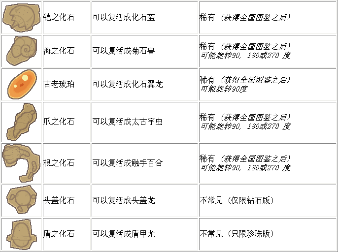 化石部分: 海之化石:钻石是不常见,珍珠是非常稀有 铠之化石:钻石是非常稀有,珍珠是不常见 爪之化石:钻石是不常见,珍珠是非常稀有 根之化石:钻石是非常稀有,珍珠是不常见