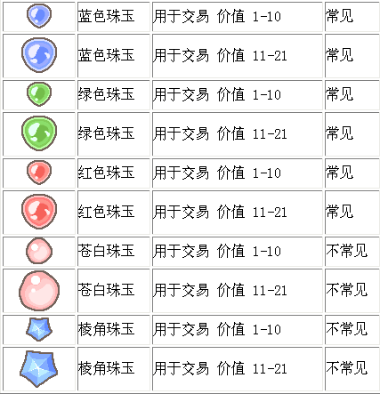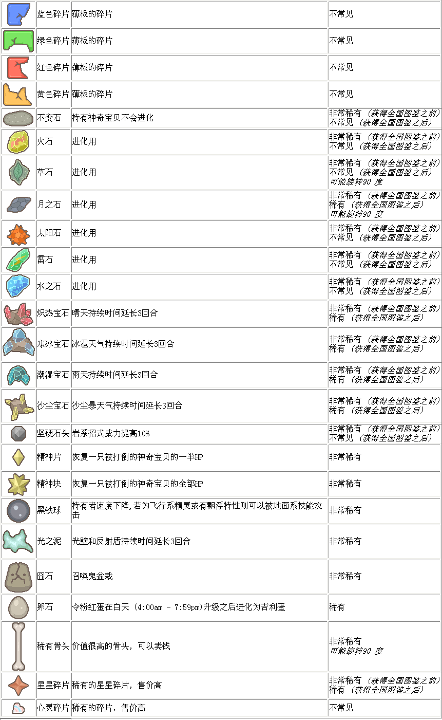 普通道具更新图鉴后的部分: 炽热宝石和寒冰宝石:钻石是不常见,珍珠是稀有 潮湿宝石和沙尘宝石:钻石是稀有,珍珠是不常见 精神片:稀有 黑铁球:钻石是非常稀有,珍珠是稀有 光之黏土:钻石是稀有,珍珠是非常稀有 贵重骨头更新图鉴后变为稀有
