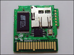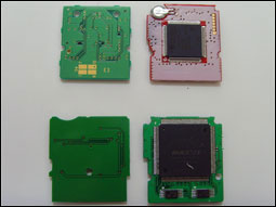正面使用的芯片应该说质量是非常上乘的,因此也可以预见未来的游戏上不会出现什么问题。背面则是一块ALTERA的MAXII的超大芯片。下放是两块4Mb的存储芯片。(居然超过正版卡,不过从任天堂的内部资料中得知,今后将会出现8Mb存储的游戏。目前已知的4Mb存储的游戏就已经出现了。而新版本ACEKARD已经支持8Mb存档)
